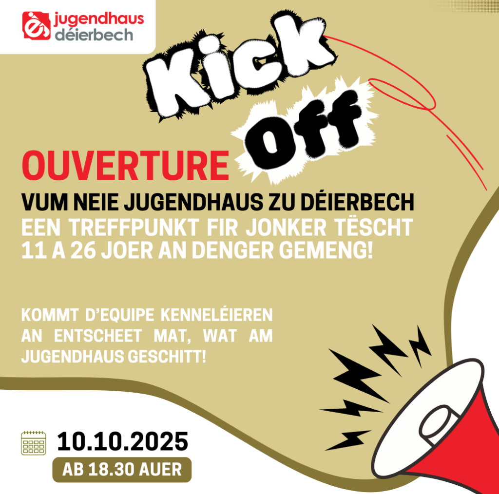 Kommt laanscht a verpasst net d’Ouverture vum neie Jugendhaus zu Déierbech! Mir luede Jonker, hir E…