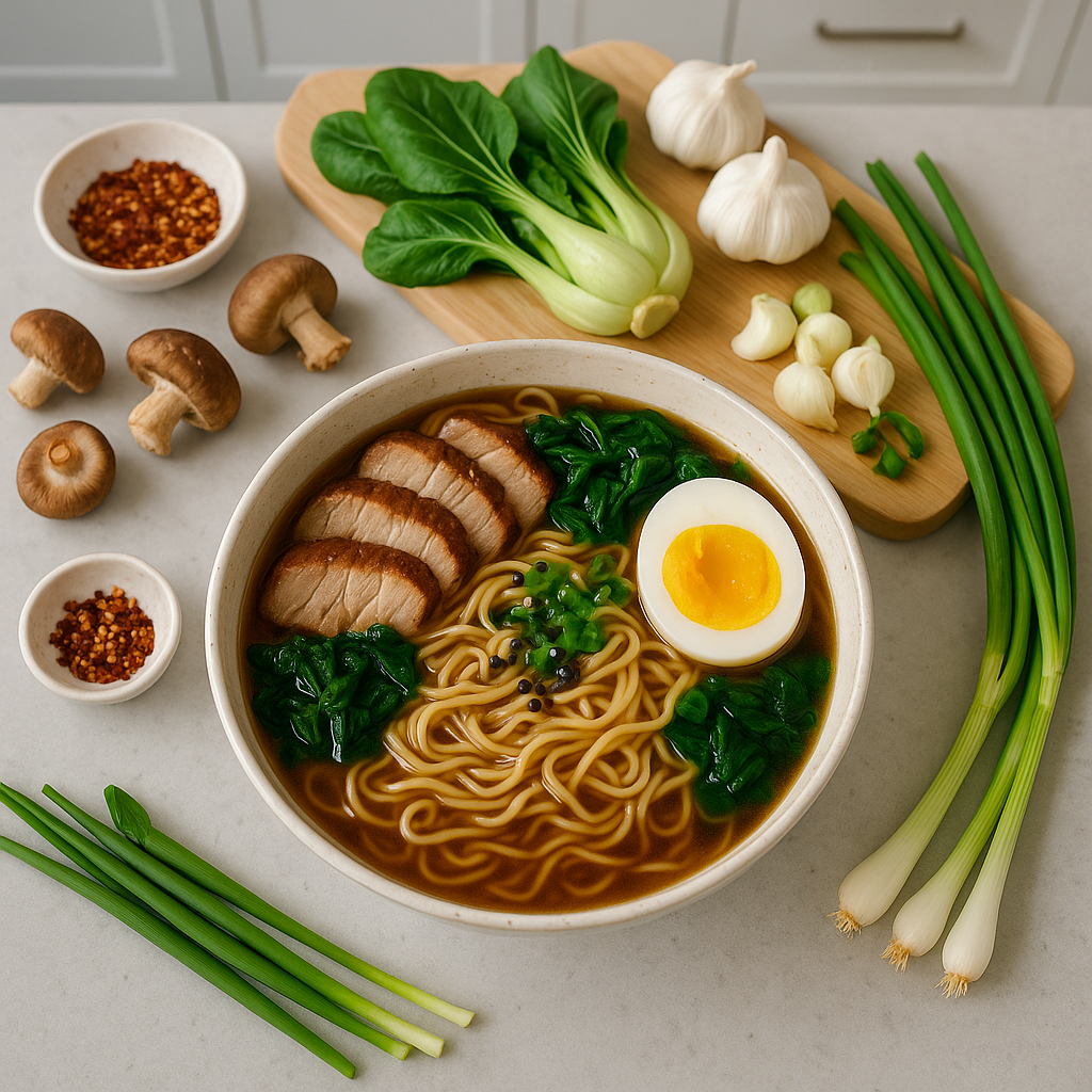 Mir probéieren eng japanesch Spézialitéit aus, Ramen, eng Zopp mat Nuddelen, Eer….