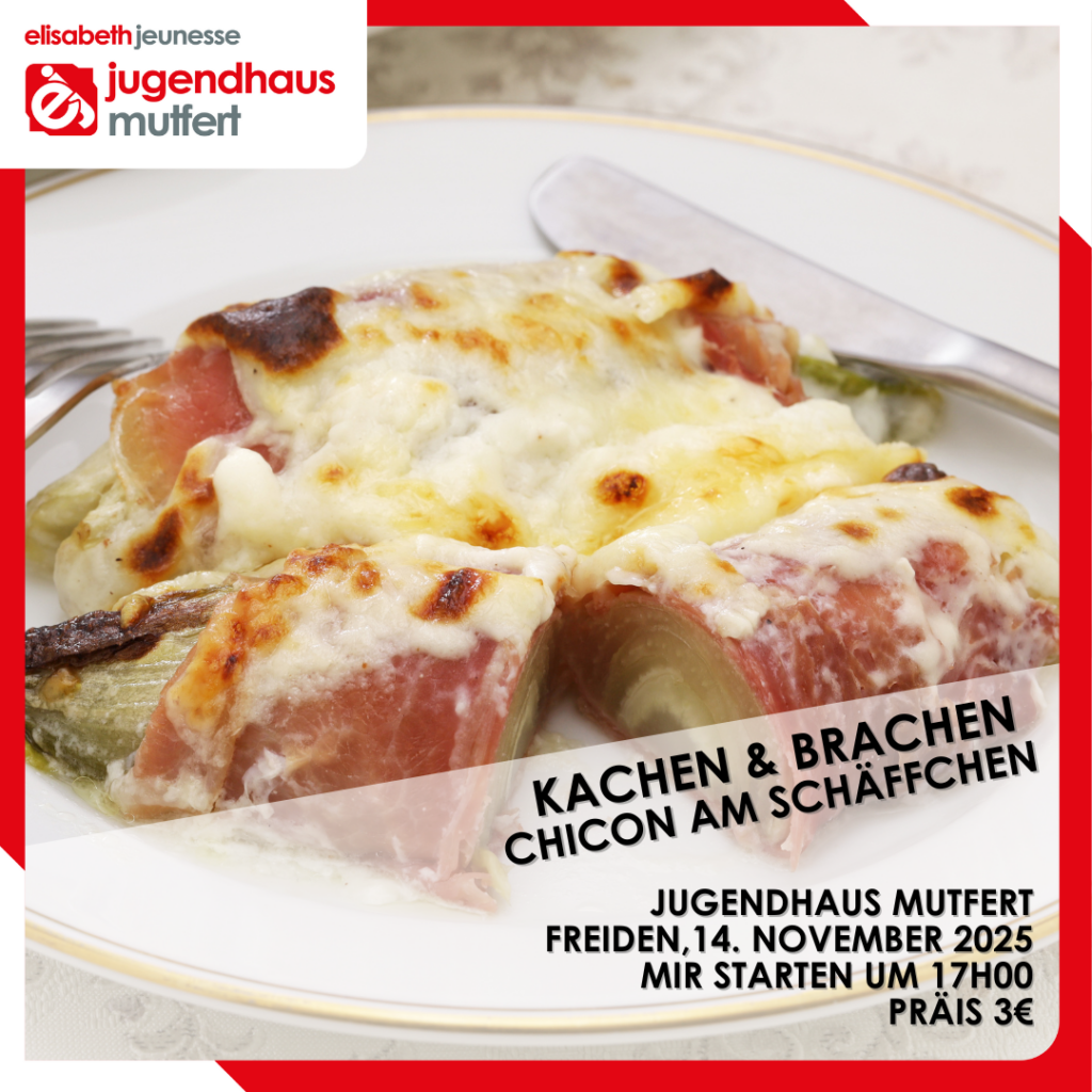 Et ass Freiden, also steet erëm kachen um Programm! Des Woch maachen mir Chicon am Schäffchen mat ...